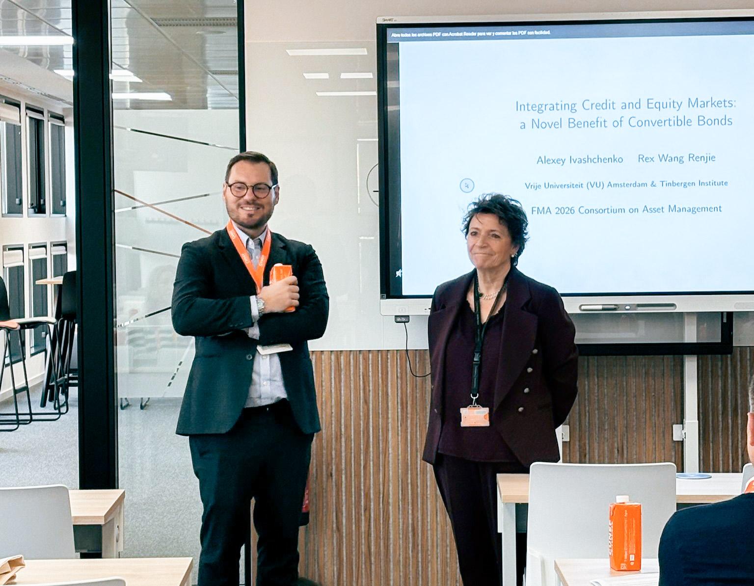 A lo largo de la jornada se presentaron seis investigaciones punteras que abordaron cuestiones clave del asset management contemporáneo desde distintas perspectivas. Entre los temas analizados se incluyeron el papel de los bonos convertibles como puente entre los mercados de renta fija y renta variable; la democratización del acceso a activos ilíquidos a través de interval funds; los conflictos de interés en la gestión de fondos de pensiones; los mecanismos de liquidación forzosa en plataformas como Robinhood; la aplicación de la inteligencia artificial en la gestión activa de carteras; y la exposición implícita del Tesoro estadounidense a la duración en la sombra.