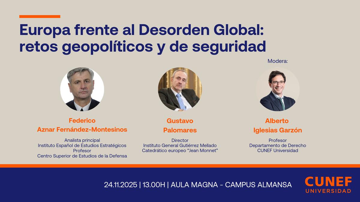 La sesión contará con la participación de Gustavo Palomares, director del Instituto General Gutiérrez Mellado y catedrático europeo “Jean Monnet”; Federico Aznar Fernández-Montesinos, analista principal del Instituto Español de Estudios Estratégicos y profesor del Centro Superior de Estudios de la Defensa (CESEDEN); y será moderada por Alberto Iglesias Garzón, profesor del Departamento de Derecho de CUNEF Universidad.